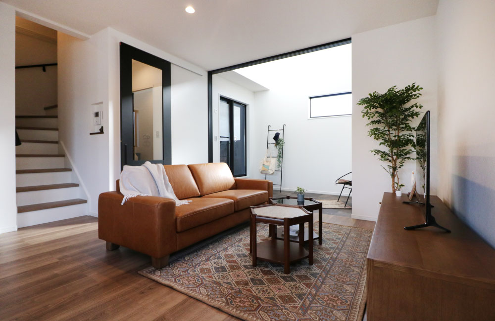 周囲からの目線を気にせず、家族がのびのびと暮らせるインナーテラスのある家が完成しました。南からの暖かい日差しに包まれながら、解放感あるインナーテラスは、リビングダイニングとは違った特別な空間。リビングとの間にある扉を閉めることで、一つの部屋になるため、ライフスタイルに合わせて様々な楽しみ方ができます。ゆとりある暮らしができるよう、一般的なサイズより2サイズ大きいユニットバス、2WAY玄関に大容量のウォークインクローゼット、3階のセカンド洗面など家族構成やライフスタイルが変わっても余裕があるつくりに。黒やグレー、モルタル調などの無機質なクロスや床材をあしらい、家具やインテリアはレザーやアイアン素材を取り入れ、インテリアは遊び心のあるものをセレクトしています。