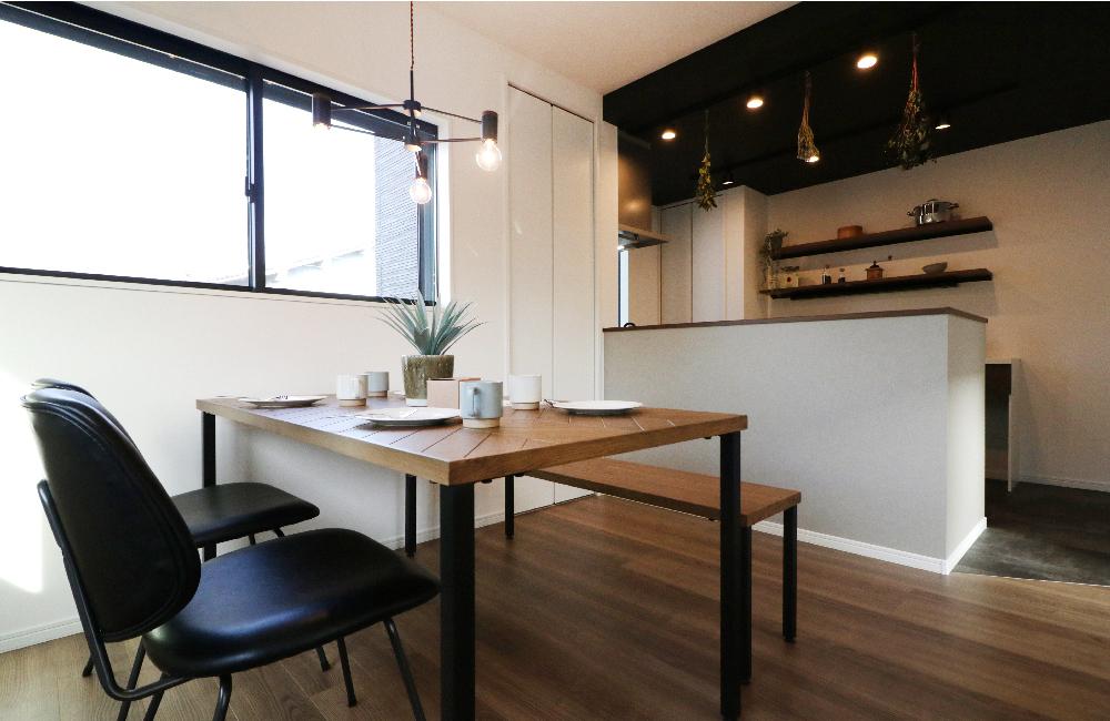 内装は、彩度を抑えたエイジドチェスナット柄のフロアに、ブラックやグレー、モルタル調といった無機質さを加えた、インダストリアルテイストにしています。キッチンは、ブラックの折下天井でゾーニングし、ダクトレールにドライフラワーやグリーンを飾れば、お気に入りのカフェのような空間に。インテリアには、レザーソファや木×アイアンを使った家具などを取り入れ、よりインダストリアルな雰囲気を醸し出してくれています。かわいいよりかっこいいが好きな方に、ぴったりなテイストです。