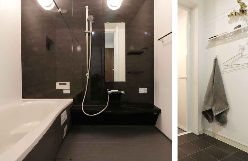 浴室は、一般的なサイズより2サイズ大きいユニットバスを取り入れました。奥行きがあるため洗い場が広く、子どもと一緒に入ってもゆとりがあり、のびのびと身体を洗うことができます。また、浴室前の壁には、マグネット対応のボードを備え付けました。様々なマグネットアイテムを使って、バスタオルやスキンケア用品を置けば、お風呂上りにサッと使うことができます。