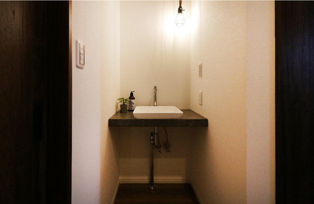 3階へ上がってすぐのところに、セカンド洗面を設けました。モルタル調のカウンターに、木目×ブラックの雰囲気あるペンダントライトを吊るした、かっこいいデザインになっています。掃除や就寝前の歯磨きなど、水を使いたい時にわざわざ1階まで降りる必要がなくなります。洗面台が2ヶ所にあるので、身支度のタイミングが重なりやすい朝の混雑時に、取り合うことがなくなり、ストレスフリーな生活が送れそうです。
