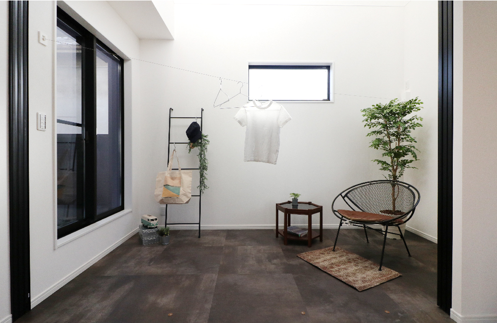 リビングとバルコニーの間に、約3帖のインナーテラスをもうけました。上部は吹抜けになっており、南からの光が心地よく降り注ぎます。床材には、傷に強く、お手入れがしやすいフロアタイルを使っているので、トレーニングスペース、子どもやペットの遊び場にぴったり。家事や仕事をしながら、見守れ、危険が少ない空間なので、日光浴が好きなペットも一日中安心してくつろぐことができます。必要な時だけワイヤーを伸ばして、パッと手軽に洗濯物を干せる、物干しも設けているので、室内干しスペースとしても◎
