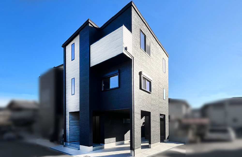 ブラックをベースに、味のある木目調のサイディングをアクセントに取り入れた、ヴィンテージテイストのお家。キリっとかっこいい外観は、特別感を持って住んでいただけるデザインです。