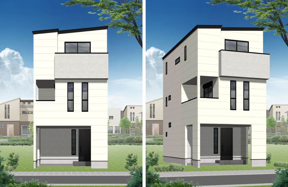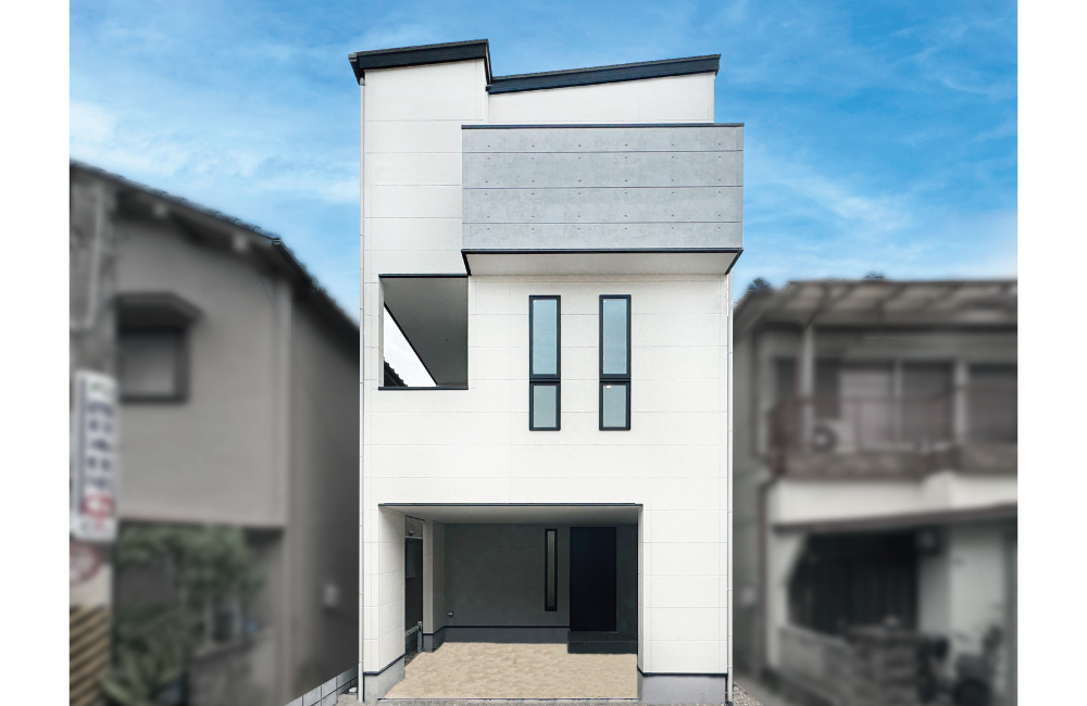 フラットサイディング× 打ちっぱなし調のサイディングでシンプルで無機質なイメージに。片流れ屋根に直線的なシルエットで、スタイリッシュなデザイン。全体的に白で統一し、さわやかで都会的な印象に仕上げています。