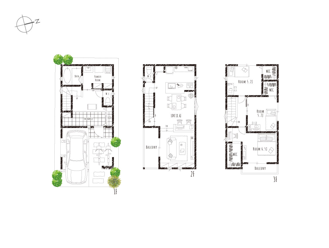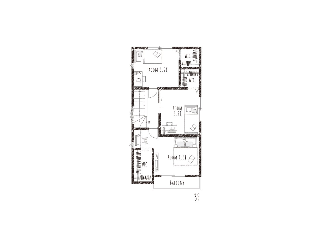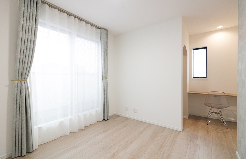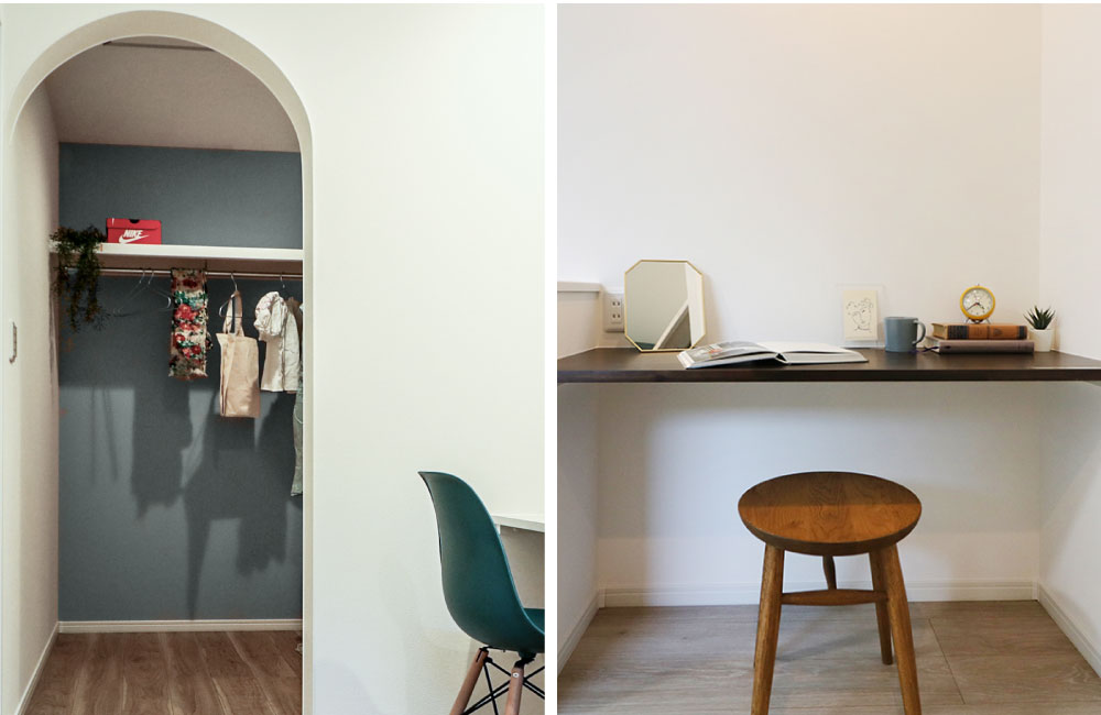 3F主寝室にはウォークインクローゼットの横に、身支度しやすいカウンターを設けました。外出前のスタイルを決めながらメイクや髪を整えられる空間は、朝の身支度をワンコーナーでシンプルに済ますことが出来ます。