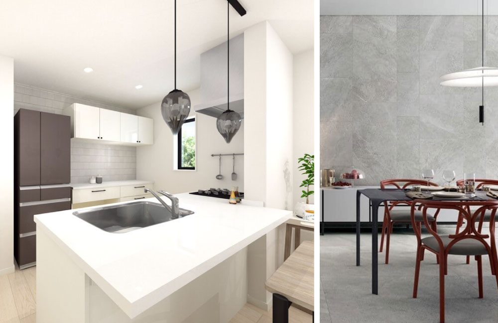 スキップフロアの上部に設置することで視界がひらけた、開放感抜群の対面式フラットキッチン。目の前がダイニングになっているので、配膳や後片付けもしやすく、家族も料理やお手伝いに参加しやすいつくり。背面にはカップボードやパントリーもあり、作業場所や食器・食材の置場にも困らずスッキリ。カップボード上部には、天然石のタイルを配し、スモーキーなやさしい色目と素材感でおしゃれなアクセントにしています。