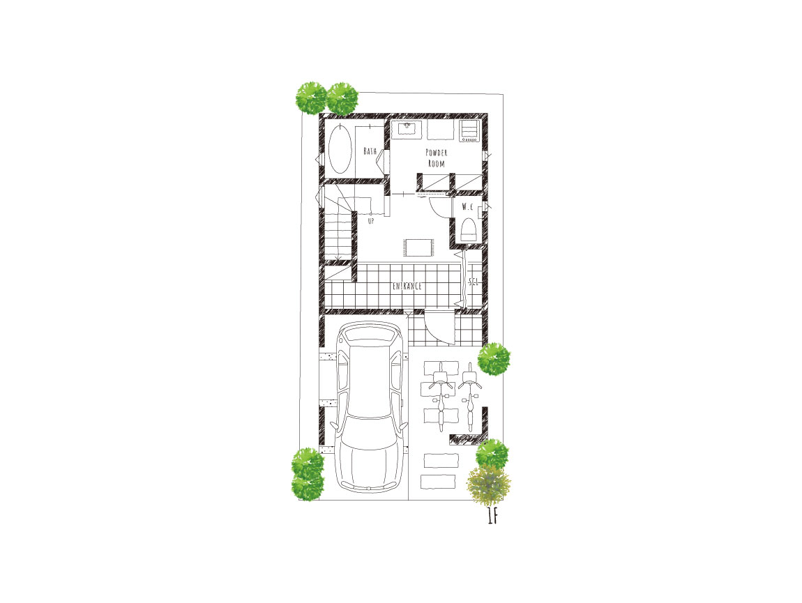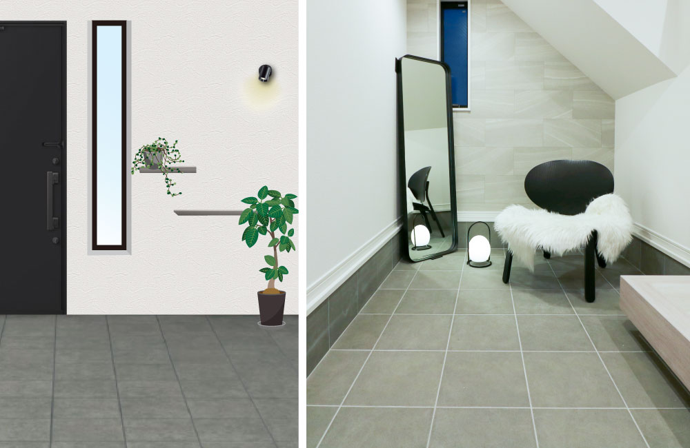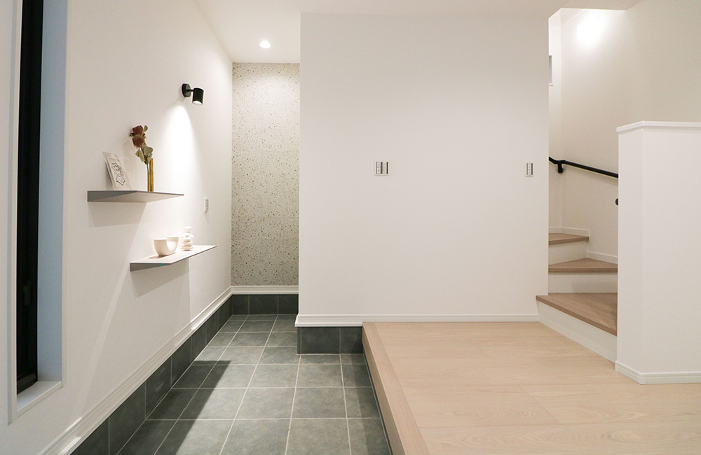 広い間口の土間玄関と開放感ある玄関ホールは、ベビーカーや自転車など、外で使うものもラクに置けるスペースにしています。壁面にはお気に入りの雑貨やグリーンを飾れる飾り棚とブラケットライトを施し、階段下には可動棚をご用意。家族が毎日使い、お客様からも見られる場所を、おしゃれで使いやすくしています。
