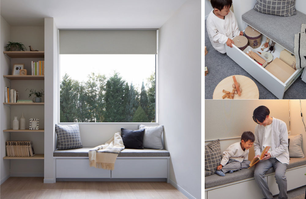 リビングの窓辺にしつらえた、多目的に楽しめるくつろぎスペース。約3mの引き出し付きのベンチは、しっかり収納力も備わっており、お昼寝用のブランケットや、子どものおもちゃをしまったり、よく使う書類や本もたっぷり収納。しまいやすく、取り出しやすい引き出しがあることで、物の多いリビングもすっきり。子どもと本を読んだり、まったりお茶を飲んだり、いろいろ使える癒しの場所にしています。