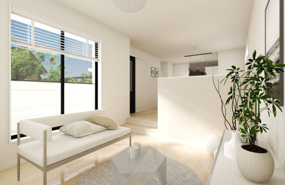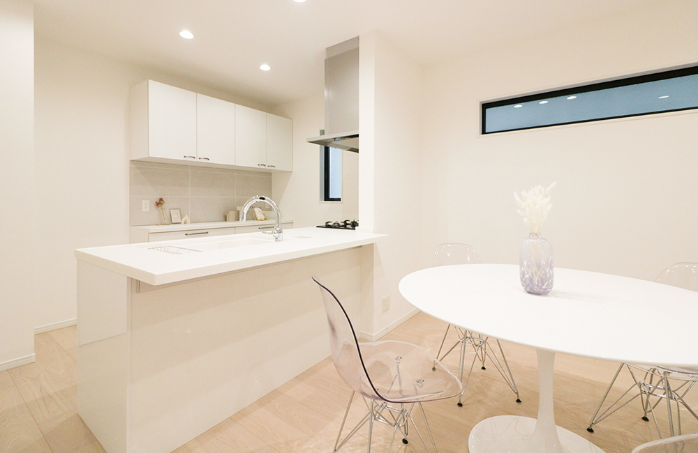 白を基調にしたシンプルな内装で『すっきり』、スキップフロアで『抜け感』が感じられるお家が完成しました。空間を高低差やスタディカウンターでゆるく仕切ることで「開放的」に、収納も兼ね備えたリラックスベンチで「居心地良く」、様々な動きで空間に変化をつけました。忙しいくらしの中、家事や生活が時短できるよう、「洗濯が1か所で済む洗濯室」や「料理や家事をしながら、家族の様子が伺えるキッチン」「出かける準備のしやすいクローゼット」など、たくさんの工夫を散りばめました。シンプルをテーマにしたお家ですが、寝室のクローゼット入口をR垂れ壁にしたり、キッチンには天然石を組み合わせたタイルを施し、リビングの床だけ少し濃い目の突板のフローリングにするなど、さりげないディティールにこだわり、住むほどに人に寄り添う、そんなお家にしています。