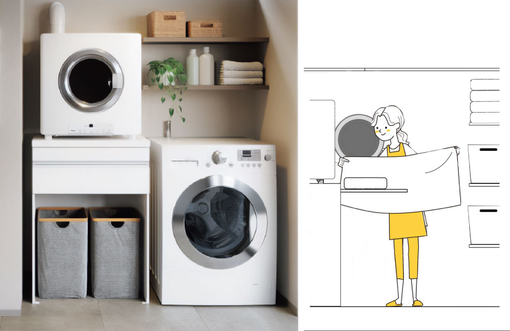 洗濯時間を少しでも短縮できるよう、乾太くん(ガス乾燥機)を「スライド天板付きの設置棚」に据え、乾燥機から出したものをすぐ畳めるようにしました。乾燥機にかけたくない、大事なお洋服や大きなものは、すぐ横の「室内物干し」や「浴室乾燥機」に干せばOK。洗濯室内にタオルや下着類など、お風呂上がりに必要なものをしまえる「可動棚」も備え、『干す・乾かす⇒畳む⇒しまう』までの動線を短くし、家事の時間を短縮できるようにしています。