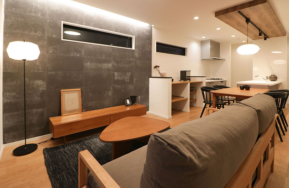 テレビ背面のアクセントウォールに、セメントみたいな新素材 ”SOLIDO” を取り入れ、折上天井から間接照明で照らしています。ムラのある朽ちたような素材に光のグラデーションを加え、味わい深い雰囲気に。キッチン部を木目の折り上げ天井でゾーニングし、ダクトレールに照明やグリーンを吊るして、アレンジを楽しめるようにしています。ブラックとグレーを基調とした、素材感と温かみある木のブラウンが調和された、重厚感あるモダンなリビングです。