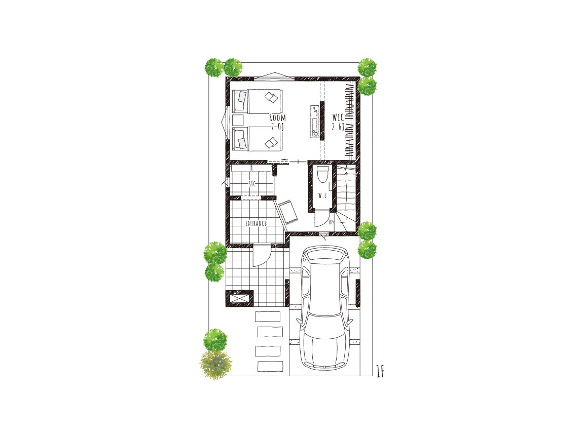 微妙に色味と質感の異なる2種類の白×グレーの木目調サイディングをアクセントに、スッキリとしたシルエットで、可愛くなりすぎないカジュアルにした外観。インナーガレージになっているので、雨の日も車の乗り降りで濡れずにすみ、自転車の置場も困りません。