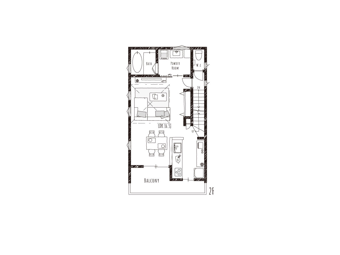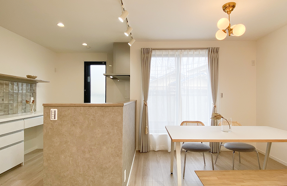 南に開けた大きな吹抜けで、開放感ある明るいLDK。吹抜けを通じて、3階で過ごす家族の様子も感じられ、外出や帰宅時にはリビング階段をとおり、「ただいま」と「おかえり」が言い合え、リビングに居るだけで、常に家族の存在を感じられます。柔らかいくすみ系グレージュのフローリングや建具に合わせて、ホワイト・ベージュ・グレーに色目を統一し、木目や石目などの素材感を感じさせる内装で、やさしいカジュアルテイストにしています。照明に、ゴールドのアクセントを取り入れ、カーテンやラグには、空間になじむ素材感あるものを選び、可愛らしくも大人っぽいイメージをプラスしました。