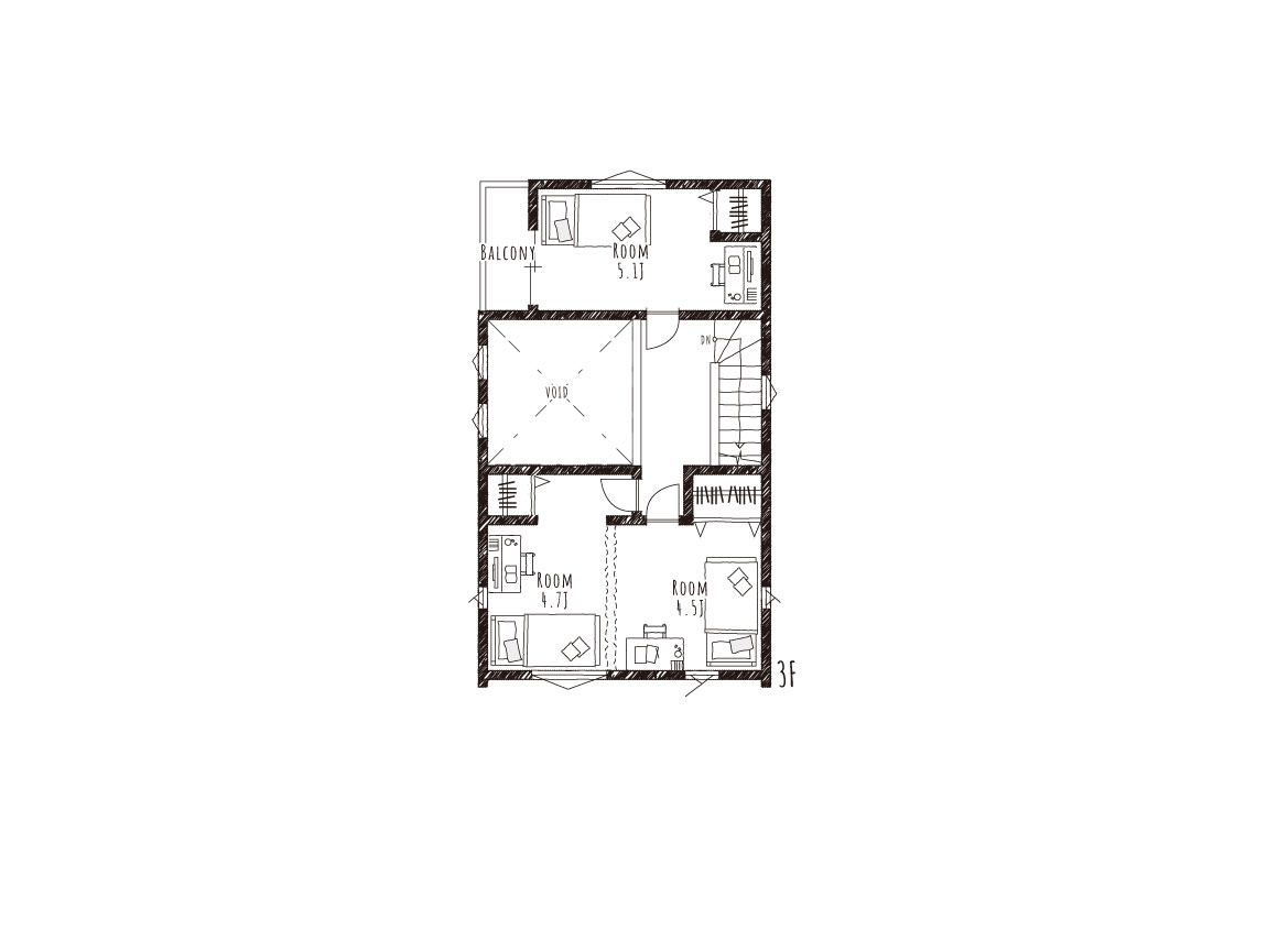 3Fには、将来2つに分けられる、ドアと収納を2つ設けたお部屋をご用意しました。子どもが小さいときは、家族みんなで寝たり、1つの部屋でのびのび遊んだり。子どもが成長してからは、家具で間仕切ったり、壁を設ければ、各自が勉強に集中できる環境をつくれます。働き方が変化して、リモートワークが必要になっても、自宅に仕事部屋が確保できるのも嬉しいポイントです。