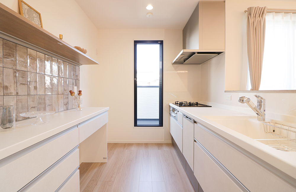 Ⅰ型キッチンの背面にカップボードを配した、コンパクトな動線のキッチン。振り返るだけで、調理済みのものを置いたり、洗い終わった食器をしまうことができます。カップボード上には、ヴィンテージ調のタイルと飾り棚を施し、お気に入りの食器や雑貨を飾って、お店みたいな『見せる収納』に。リビングもダイニングも見渡せ、家族の様子をうかがいながら、安心して家事ができるキッチンです。