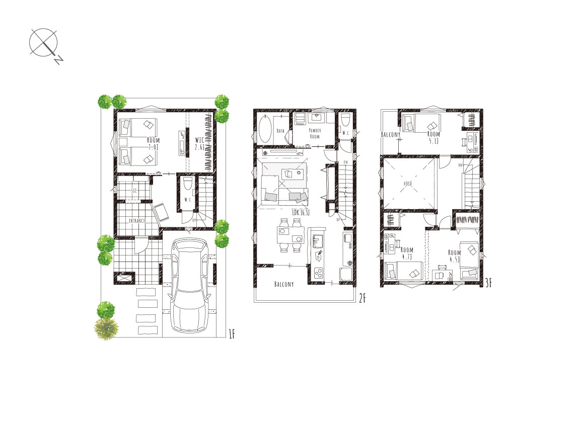 3方を建物に囲まれた条件の中で、比較的高さの低い2階建てがある南面から、いかに効果的に光を取り入れるプランにできるかで悩みました。光を取り入れる大きな吹抜を設けつつ、各々の空間の広さを確保し、狭苦しくならないプランになるように工夫を凝らしました。大きな吹抜がありながらも大きなウォークインクローゼットや、将来間仕切りではあるが4LDKを計画し、家全体のボリューム・広さも意識したプランになっています。キッチンからバルコニーに直接出られるレイアウトや2Way玄関等、家事や生活動線も意識した間取りとしました。