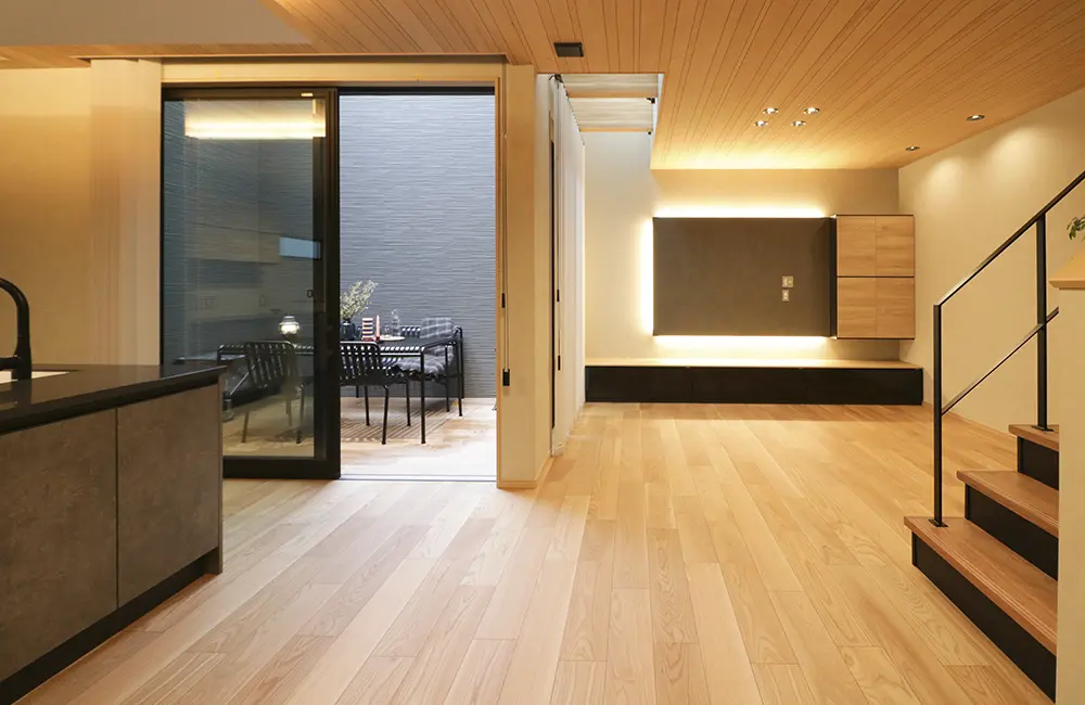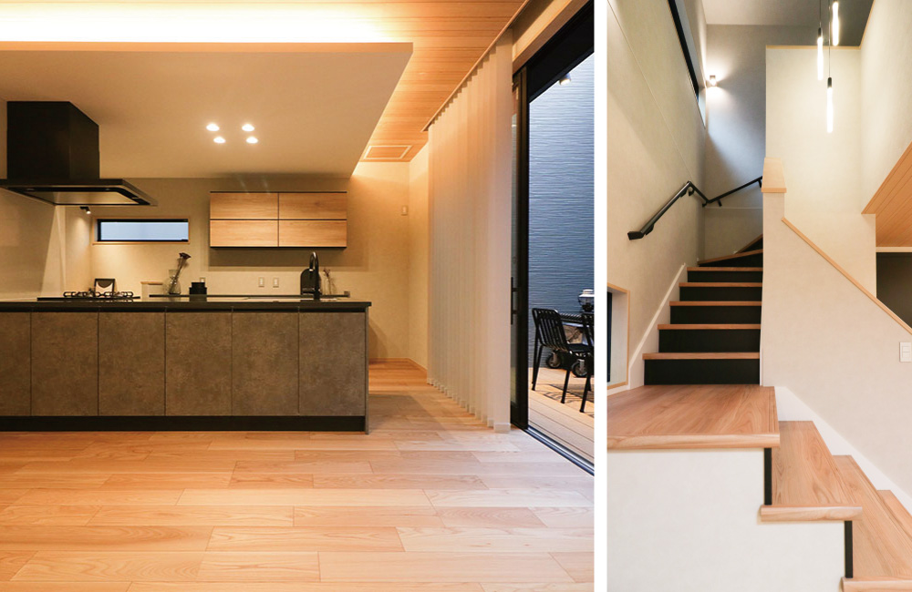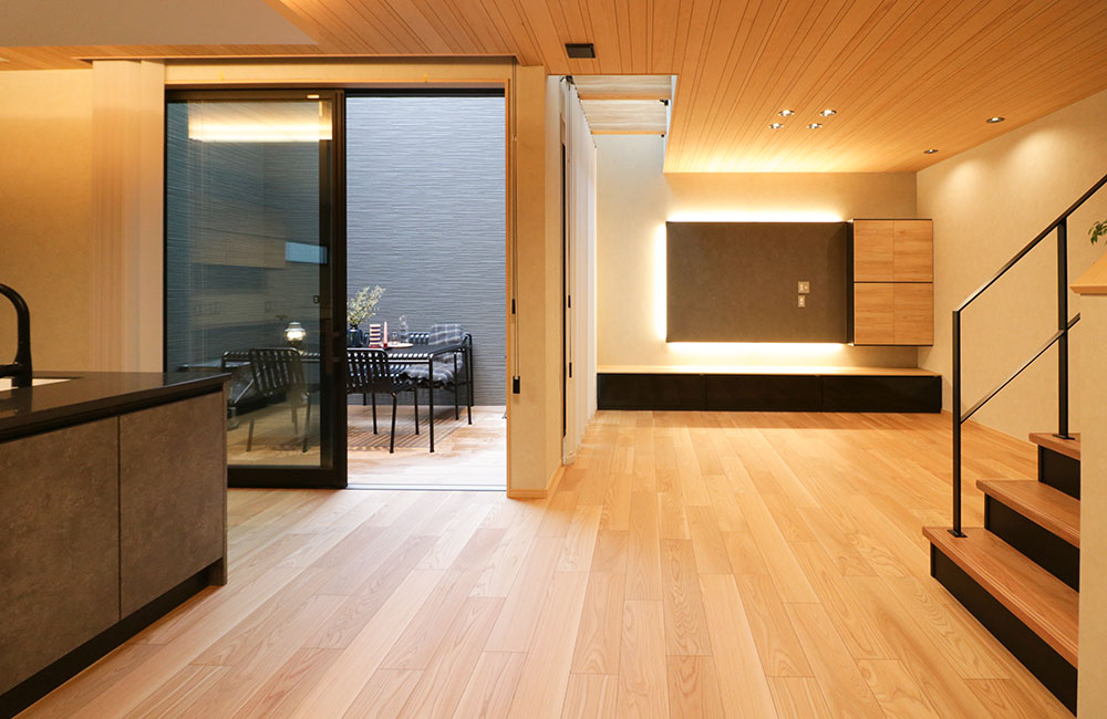 木の風合いとお日さまの温かさあふれるLDKの真ん中に、中庭みたいなバルコニーを設けた「アウトドアリビング」のある家が完成しました。お部屋の一部のように外と中を行き来でき、LDKとバルコニーで家族が互いを感じながら、心地よい距離感で過ごせます。リビングは、天井にも床にも天然木突板を使用した、木の風合いがあふれる空間。キッチンを折下げ天井と間接照明でふんわりゾーニングし「居心地の良さ」を感じられるように。スタイリッシュなブラックキッチンや、リビング階段のブラックアイアン手すりでキリっとアクセントを効かせ、ホテルみたいな「上質さ」も演出。他にも、お家を清潔に保てる、玄関横に洗面室を設けた「帰宅動線」や、趣味や仕事に集中できる「書棚のある書斎」。家事の合間にホッと一息つける、キッチン内の「ワークカウンター」などの、生活しやすい工夫を揃えています。住宅内で使用する電力を自ら創出したエネルギーでまかなえるように考えられた「ZEH-ゼロエネルギーハウス」を採用し、快適な温度と湿度、結露のないきれいな空気の中で生活でき、ダブル発電で電気代も抑えられ、災害時も安心。上質で暮らしやすく、環境にやさしい生活ができるお家です。