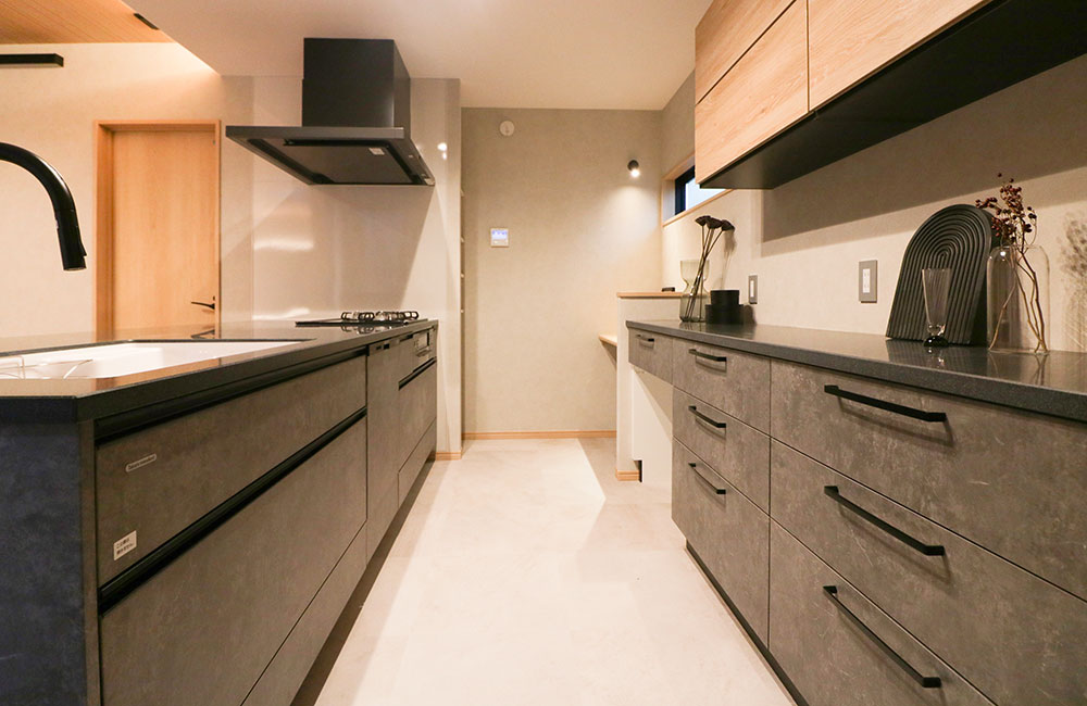 スタイリッシュなブラック天板のオープンキッチンには、しっかり収納できるカップボードと扉付きのキャビネットを設け、スッキリ隠せてしまえるように。キッチンの一番奥には、ワークカウンターをご用意し、レシピを調べながらお料理したり、お子さまの宿題スペースや、ママだけの小さな基地として、ホッとひと息つける、ちょっと籠り感のある場所に。床には石目調のフロアタイルを敷き、お手入れもしやすくしています。