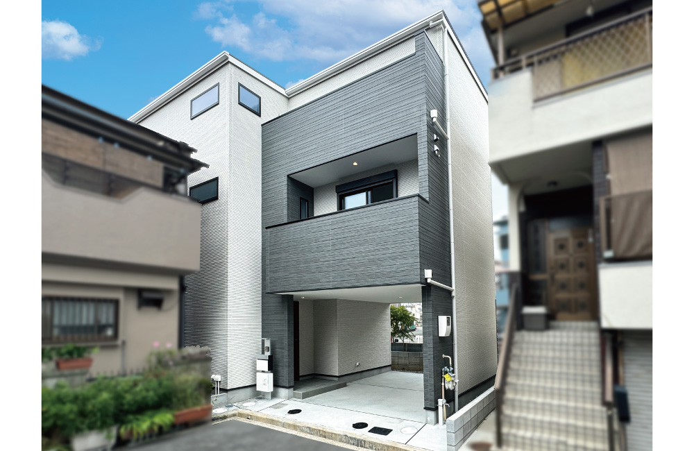 白×グレーのスッキリとしたシンプルな外観。ガレージの間口を約3.6mと広くとることで、車を入れやすく、自転車やバイクも置けるようにしています。屋根付きガレージ内には、屋外コンセントもご用意しているので、EV車の充電や掃除、DIYなどの作業もらくにできます。
