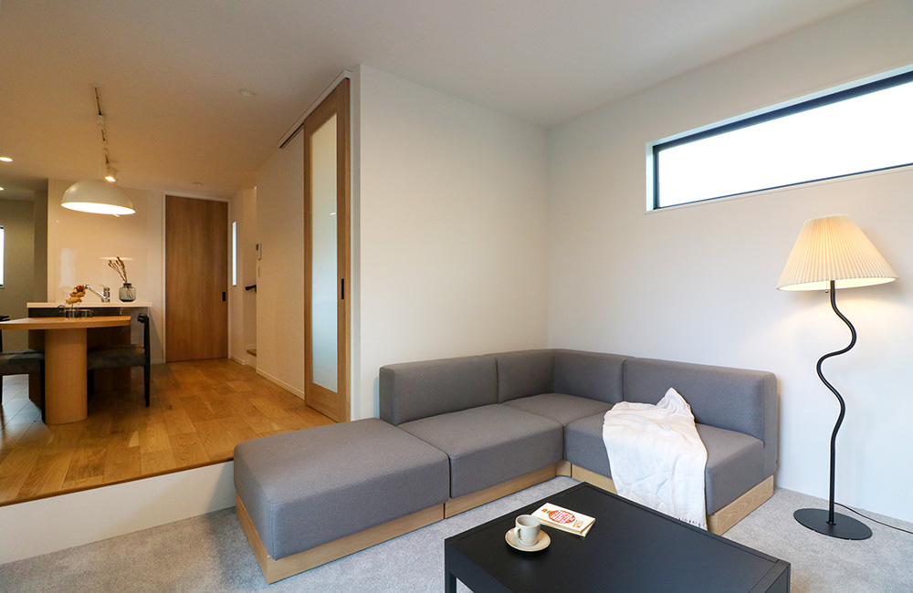 奥まったところにある敷地であったため、間口いっぱいにガレージ入口を確保し、ストレスなく駐車ができるよう配慮しました。リビング部をダウンフロアにすることで、開放感が出るように。ダウンフロア部は、タイルカーペット仕上げとし、重心を低く広くみせるように。ダイニングキッチン部と高さや床材の変化で緩やかに区切り、自然と家族が集まるたまり場となるよう計画しました。シンプルな水平ラインが際立つ、造作テレビボードも併せて計画し、空間がよりスッキリ見えるようにしています。