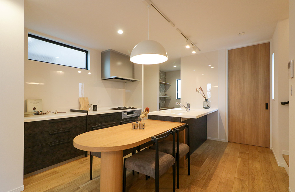 ダイニングとキッチンに一体感を持たせ、動線をシンプルにすることで、お料理はもちろん、配膳や片づけもスムーズに。行き止まりのない回遊動線なので窮屈感もなく、並びにパントリーもあるので、ゴミ箱なども隠してしまえてスッキリ。調理スペースとダイニングが近く、パンやお菓子作りの時には、テーブルの広いスペースでの作業も可能に。みんなで餃子を包んで焼きながら食べたり、和気あいあいと過ごせる、家族とコミュニケーションの取りやすいキッチン。もちろん、ちょっとしたデスクワークや子どもの宿題スペースとしても◎