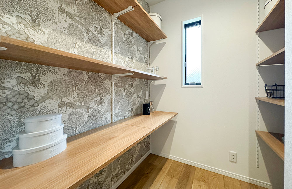 キッチン横のパントリーを兼ねた家事室。リビングからは死角になるので、見せたくないものはこちらに収納。家族から離れて集中して趣味や読書をしたい時にも、こもり感あるスペースではかどりそう。もちろん子どもの宿題スペースにしても◎鹿と小川をモチーフにした、ウィリアム・モリスの「THE BROOK」の壁紙を眺めながら「ホッとひと息」。ママの秘密基地としても、程よいスペースです。
