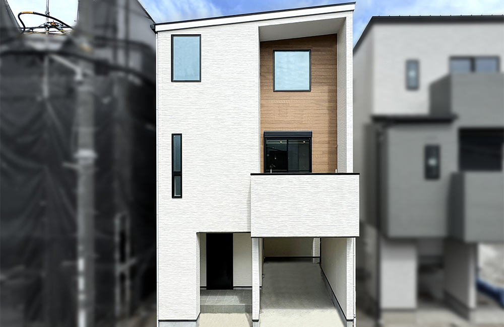 シンプルな片屋根づくりのシルエットと、ホワイトの石目調×木目の外壁で、さわやかな色目と自然を感じさせる素材でナチュラルな雰囲気にしました。インナーガレージになっているので、雨の日も濡れずに乗り降りしやすく、バルコニーの手すりも、高めにしているので、外からの視線も気にならずにすみ、生活感を感じさせず、すっきりと暮らせます。