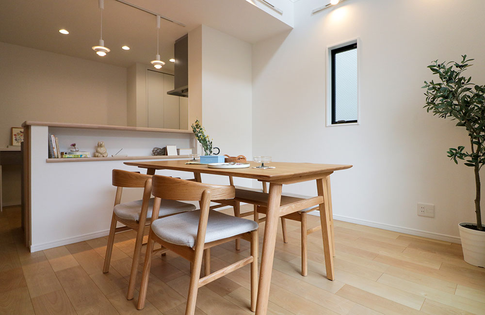 キッチン内の目隠しにもなるキッチンカウンターにニッチを施し、調味料やリモコンのちょい置き、ミニギャラリーとして、小物や写真を飾れるスペースを作りました。上部には、ペンダントライトで乳白色のやわらかなあかりを灯して、やさしい北欧調の雰囲気に◎動線の短いⅠ型キッチンには、振り返るだけで、お皿や家電にも手が届く、カップボードとパントリーをご用意。「出来た料理はどんどんカウンターに置いて」「テーブルの家族に取ってもらう」みたいな連携プレイをしながら、和気あいあいと食事が楽しめます。