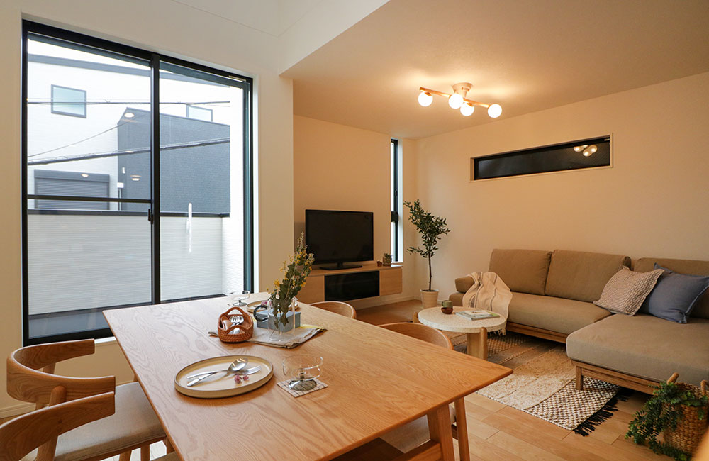 ひとつひとつの空間にゆとりを持たせ、南向きのLDKには吹抜けとバルコニー、3階にも人目を気にせず過ごせるプライベートバルコニーをご用意した、開放感あふれる、ちょっと贅沢な家が完成しました。吹抜けに室内窓を設けることで、光と風を通し、明るく開放感もたっぷりと。クロスや建具に木目をふんだんに使い、ナチュラルな雰囲気に。フローリングにも天然木の突板を使用し、手触りや風合いも「やさしく」「柔らかく」仕上げました。動線をコンパクトにしたキッチンには、収納もたっぷりとり「お料理しやすく」。リビングのTVボードはフロートタイプにし「お掃除をしやすく」。玄関脇に、独立洗面台を設けることで、帰宅時に「手洗いうがいがしやすく」など、「生活しやすい」工夫を詰めこみました。室内窓を通じて、家族の様子を感じられ、和気あいあいと食事を楽しめ、家族の絆も深まります。明るく開放感があり、やさしい空間で心地よく暮らせる、そんなお家です。