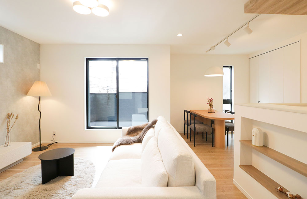 ダイニングの壁一面を収納にし、TVも壁掛けできるようにすることで、凹凸を減らし、スッキリ暮らせるLDKにしました。フローリングやクロスは、清潔感を感じさせる、ホワイト×木目で統一。ダイニング部のダクトレールには、乳白色のペンダントライトとスポットライトを配し、リビングには天井を照らす間接照明を備えたシーリングライトを。キッチン背面を間接照明で照らすなど、照明の演出で、空間の広がりと光の変化をたのしめるようにしています。無駄なものを隠し、生活感が少なく、清潔感のある空間で、照明がふんわりともる、ゆったり過ごせるリビングにしています。