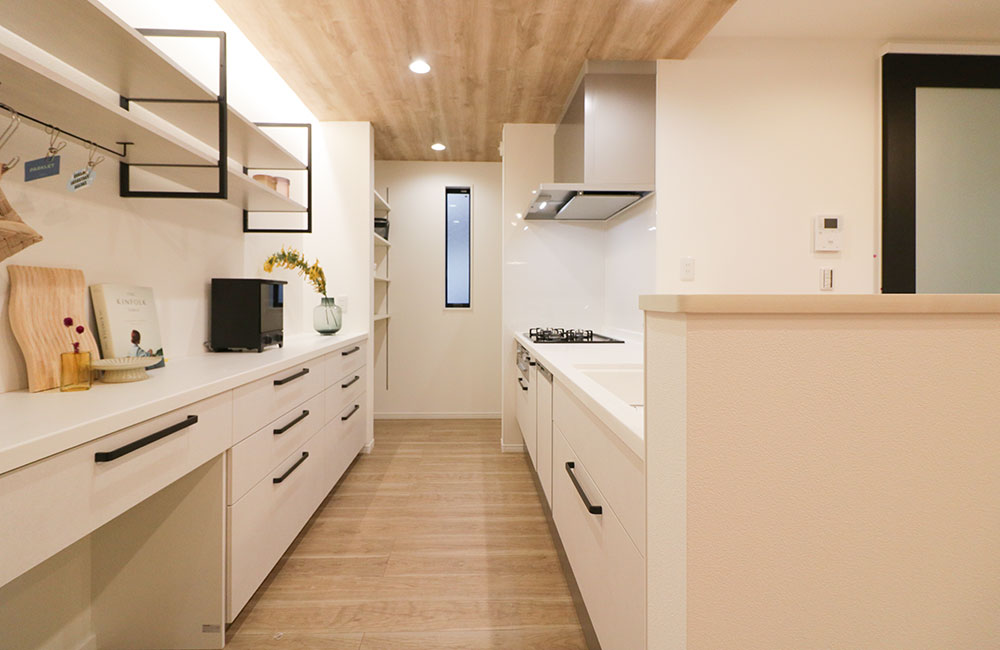 木目調クロスの下がり天井でゆるく仕切られ、飾り棚のある壁を間接照明がふんわり照らす、雰囲気あるキッチン。キッチンまわりの小物も、スッキリしまえる幅約2.7mの大き目のカップボードと、奥には壁で隠れるパントリーと冷蔵庫置場があり、ゴチャつきがちなものを隠せ、生活感が出ないようにしています。すぐ隣りにダイニングがあるので、配膳下膳もスムーズに。リビングまで見渡せるので、家族の様子を見守りながら、安心して家事をこなせます。