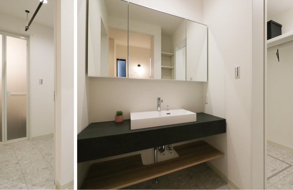 洗濯室の横に、ファミリークローゼットを設け、「洗う→干す→片づける」が、一直線で行えるようにしています。また、洗濯室~洗面台~ファミリークローゼットを、フロアタイルでつなげることで、一体感を与え、見た目に美しく、お手入れもしやすく。玄関から近い位置にあるので、帰宅して「手洗い・うがい→FCLで着替え→脱いだものは洗濯室へ」までがスムーズに済み、着替えを取りに行ったり、洗濯物を集める手間も省けます。独立洗面台も黒×木目のスタイリッシュなデザインのものを採用し、室内物干しやドアの金具なども黒で統一。生活感を和らげ、ホテルのようにスッキリした空間にしています。