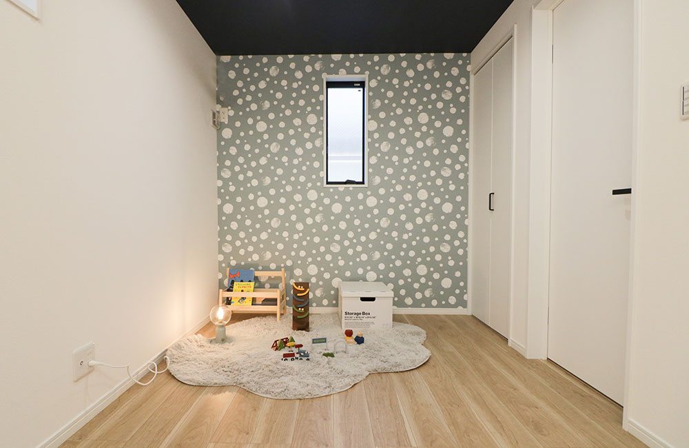 「下がり天井」にネイビーのクロスを施し、アクセントに水玉のクロスをあしらった、空間に変化のあるたのしいお部屋。ベッドサイドにふんわりと明かりが灯るよう、ブラケットライトもご用意し、かわいらしい雰囲気に仕上げています。