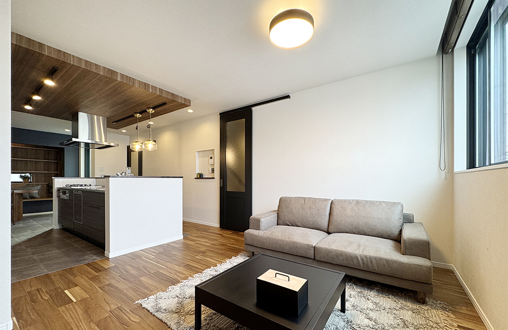 LDKを中心に木材やモルタル調の仕上げ材をたっぷりとあしらい、温かみのあるカフェのような空間に仕上げました。床材には突板を使用し、質感はもちろん経年変化も楽しんでいただくことができます。ダイニング横のヌックには本棚がありますので、足を伸ばして本を読みながらくつろいだり、ラグやクッションをおいてお昼寝したり…。食事や作業をする際には、ダイニングチェアの代わりに使用していただくなど、用途によって使い分けることができます。また、ブラケットライトやペンダントライトなどを要所に取り入れることによってポイントを作るなど、照明器具にもこだわりました。