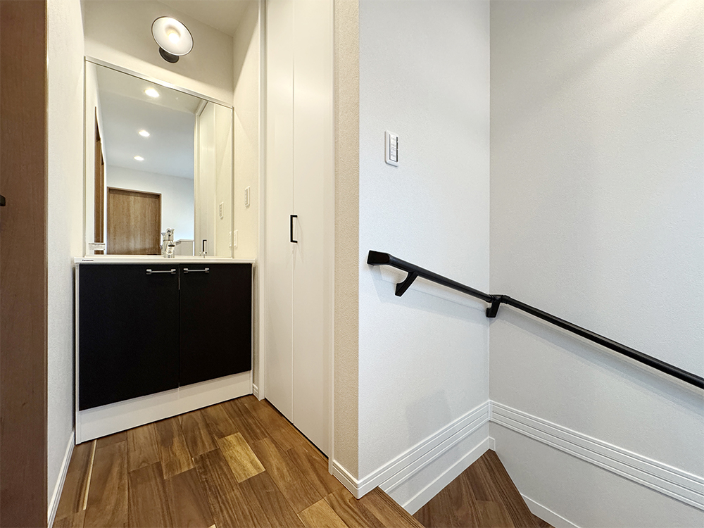 寝室のある3階には、セカンド洗面を設けました。掃除や就寝前の歯磨きなど、水を使いたい時にわざわざ1階まで降りる必要がなくなります。洗面台が2ヶ所にあるので、身支度のタイミングが重なりやすい朝の混雑時に、取り合うことがなくなり、ストレスフリーな生活が送れそうです。また、ブラケットライトで光の演出もたのしめる、おしゃれなスペースに仕上げました。