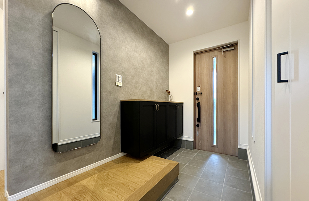 アンティーク風のブラケットライトを施し、見た目も使い勝手にもこだわったおしゃれな玄関。大容量のシューズボックスには家族の靴をたっぷりしまえ、アウトドアグッズやレジャー用品、ベビーカーなど外で使うモノは土間収納へしまえるようにしました。ブラケットライトの下には、姿鏡が取り付けられるよう下地を入れているので、鏡を取り付ければ、外出前に全身のチェックができて安心。また、L字にしたことで、横並びに座りながら、みんなでゆっくりと出かける準備ができます。