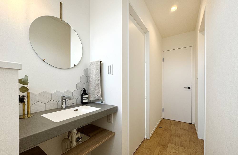 3階には、機能だけではなく、デザインにもこだわったセカンド洗面を設けました。石目調のカウンターにシンプルなペンダント照明をあしらい、ヘキサゴンタイルをバランス良くちりばめました。毎日使う洗面がおしゃれだと、それだけで気分も上がります。3階の掃除にも便利に使え、朝のあわただしい混雑緩和にも役立ちます。