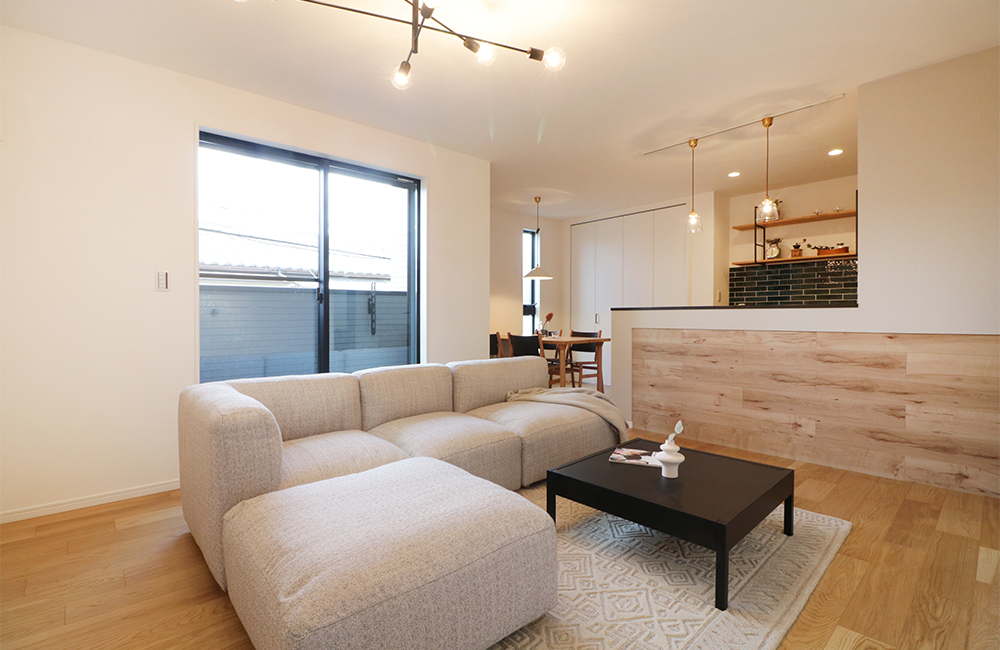 家族みんなが、ゆったり、すっきり過ごせるカフェスタイルのお家が完成しました。家族が集まるリビングは正方形にとり、みんなでゆったりとくつろげる広さにしました。すっきり暮らすために、見せる収納と隠す収納を適材適所にもうけ、簡単に片付けができるつくりに。家事がもっと楽になるよう、キッチンに回遊動線を取り入れ、家の中は無駄なくスムーズに動けるようにしています。タイルをあしらったキッチンの飾り棚に、コーヒーの道具や器などを飾れば、さらにお気に入りのカフェのような心地よい空間に。また、ダイニングと横並びになっているので、家族や友人とのコミュニケーションを楽しみながら、食事を作ったり食べたりすることができます。2階のLDK空間だけでなく、おしゃれな玄関やセカンド洗面、乾太くんが置ける広めの洗面室、1階フリールームなど、ゆとりを取りながら、デザイン性も両立させたこだわりの住まいになっています。