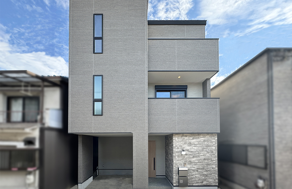 シンプルなフォルムにそれぞれ異なるグレーのサイディングをあしらい、アクセントに石目調を組み合わせた、表情に変化を付けた外観デザインにしました。間口が広いので駐車がしやすく、自転車・バイクの駐輪スペースと広く使うことができます。玄関ポーチも含めて、インナーテラスガレージになっており、雨の日でも傘をささずに玄関と行き来でき、小さな子どもを抱っこしながらの荷物の出し入れもラクラクです。