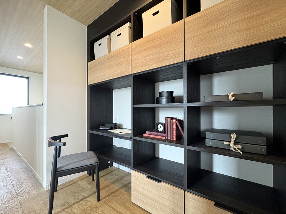 3階ホールに、収納をたっぷり設けたワークスペースをつくりました。壁に向かって設置しているので、余計なものが視界に入りにくく、集中力を高めやすくしています。子供の宿題スペースやパパママの在宅時に、ちょっと家族から離れて読書タイムにもおすすめです。吹抜けと背中合わせになっており、LDKにいる家族の気配を緩やかに感じることができます。