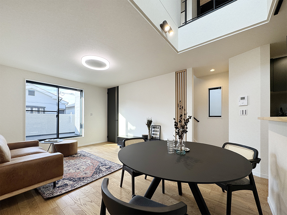 やさしい色柄の木目とマットな質感のブラックを組み合わせた落ち着いた大人な印象のナチュラルスタイルに、自然光をたっぷり取り込む工夫と、無駄のない動線計画を組み合わせた、明るく快適に暮らせるお家を計画しました。敷地裏が開けた立地だったので、上部から自然光を取り込む工夫としてLDKの中央に吹抜けを設けています。また、L型キッチンの採用で、収納量と作業スペースを広く確保しながら、コンパクトで無駄のない調理動線を実現。ダイニングやリビングとのつながりや開放感を感じるよう、シンク側が対面になるようキッチンを配置し、リビングダイニングにいる家族とのコミュニケーションもとれるようにしています。