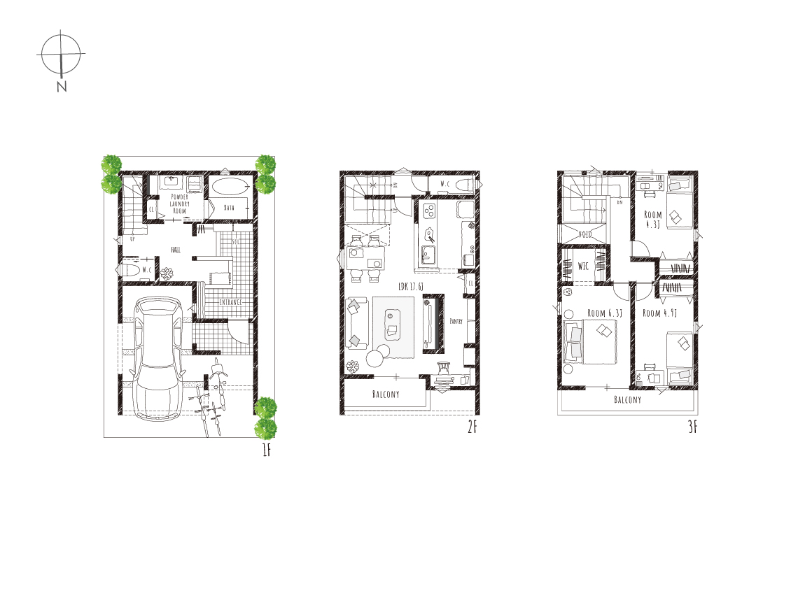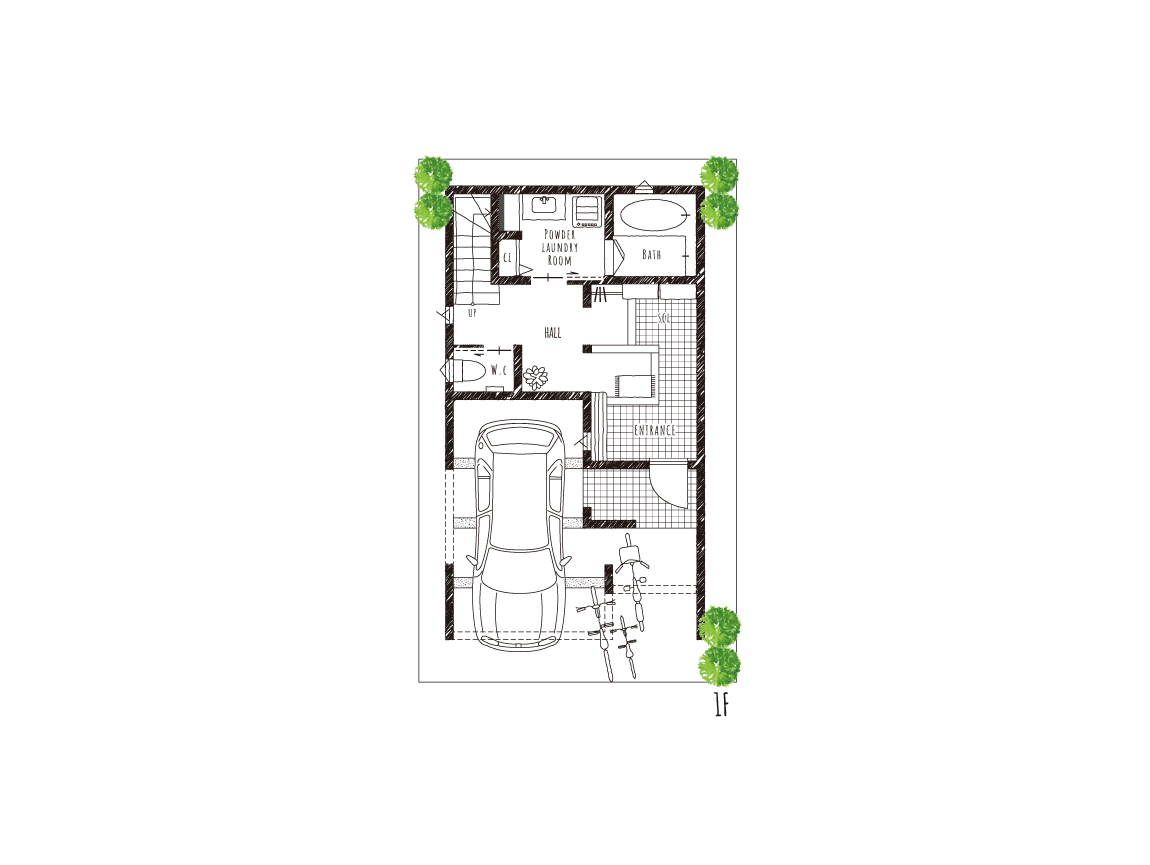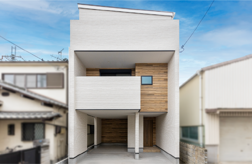 微妙に色味と質感の異なる2種類の白×木目調サイディングをアクセントに、内装とリンクしたナチュラルモダンな外観。スッキリとしたシルエットで、永く飽きのこないデザインに仕上げました。また、インナーガレージになっているので、雨の日のお買い物も濡れるのを気にせず荷物を運べます。