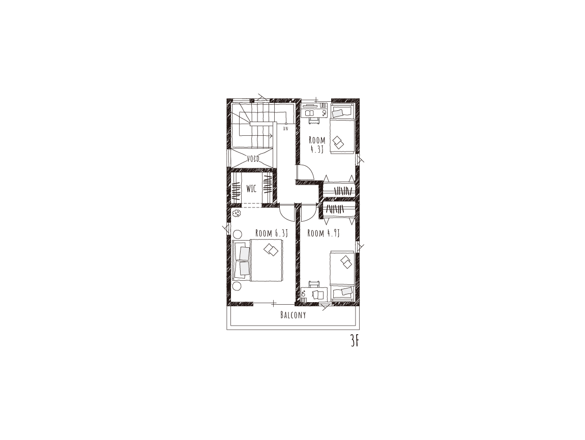 リビングには、生活感が出るものをまとめて収納できるテレビ裏の収納スペースや、スタディコーナーを設け、回遊できる動線とすることで、利用しやすく、スッキリと見せる間取りの工夫を行いました。2階建てに囲まれている敷地でしたので、3階の各部屋は明るく、吹抜け階段を利用して、2階にも南側から採光を取り入れる計画としました。また、階段の手摺を抜け感のあるアルミ手摺にしたことで、ダイニングがより明るく、居心地の良い空間となっております。
