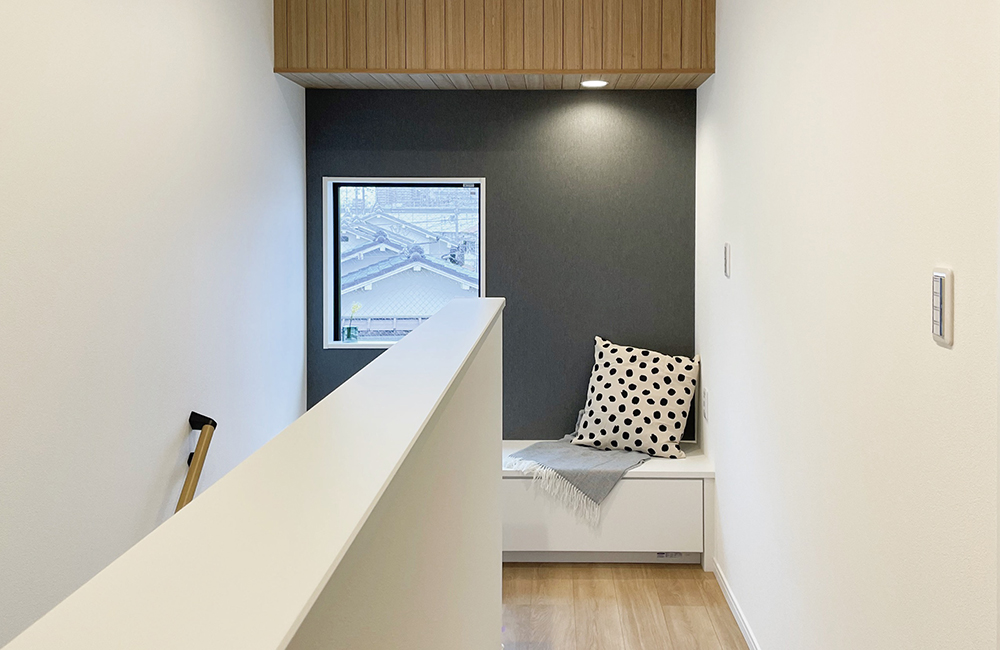 3階の階段を上がった一角に、ナチュラルな印象の折下げ天井で空間をゆるく区切った「ヌック」を設けました。南に面した大きな窓からは外の景色を眺めることができ、階段にも明るい光を落としてくれます。ベンチの座面の下は収納スペースになっており、子供のおもちゃや書籍などを収納できます。ここでは子供と遊んだり、ゆっくり本を読んだりする、家族の第二のくつろぎスペースになりそうです。