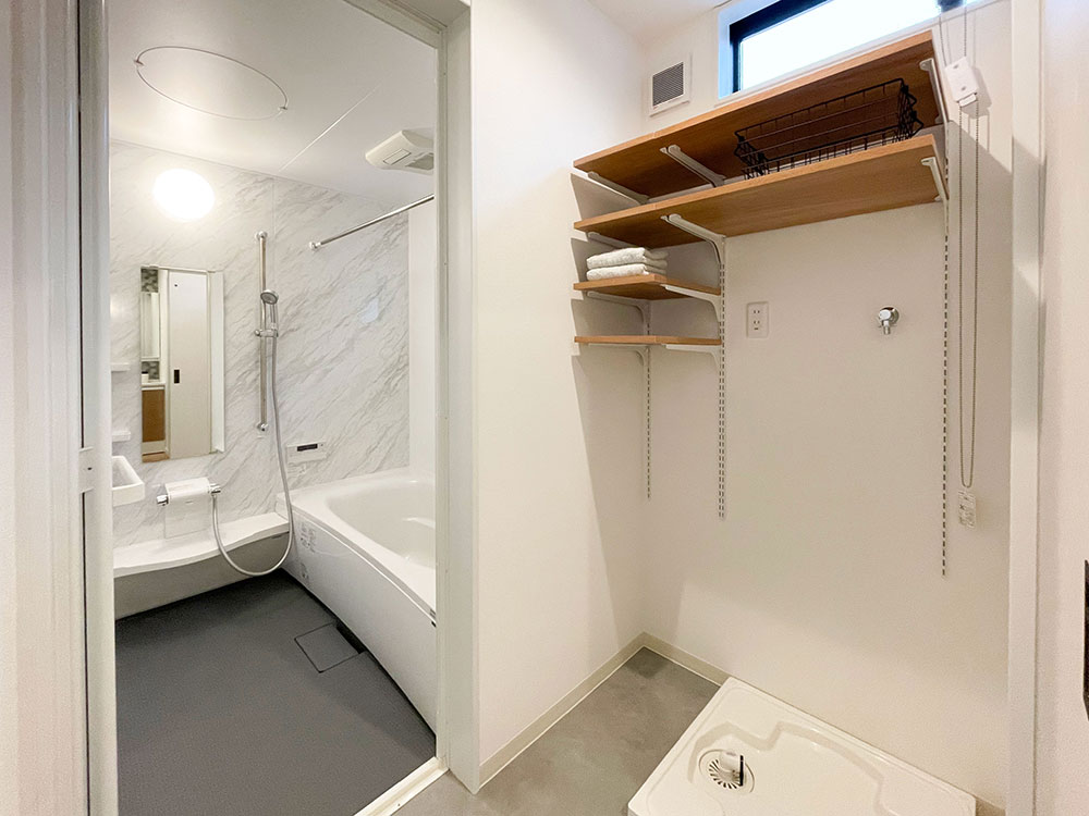 浴室・脱衣室と洗面台を分けることで、家族の誰かが入浴中でも、洗面台を利用する際には、プライバシーに配慮された快適な空間へ。脱衣室の洗濯機置場の上には、明るい光を取り入れる窓と、使いやすい高さに調整できる可動棚を設置しました。タオルや着替えのパジャマや下着、洗剤などのストック品も便利に収納することができます。