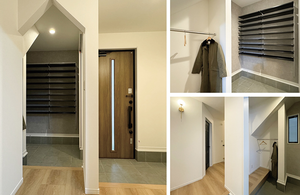 来客時でもスッキリ片付いているお客様用と、ラフに靴を脱いでも大丈夫なご家族用で玄関を分けました。三角垂れ壁がおしゃれなご家族用の玄関には、大容量のシューズクロークやベビーカーやゴルフバッグ、アウトドア用品も置けるゆとりのスペースがあります。さらに、玄関先にはコートなどのアウターをサッと掛けられるハンガーパイプも設けており、服についた花粉などを家の中に持ち込む心配もありません。