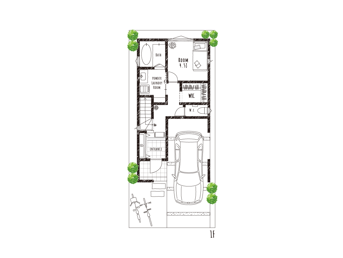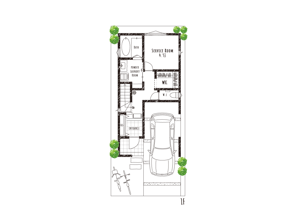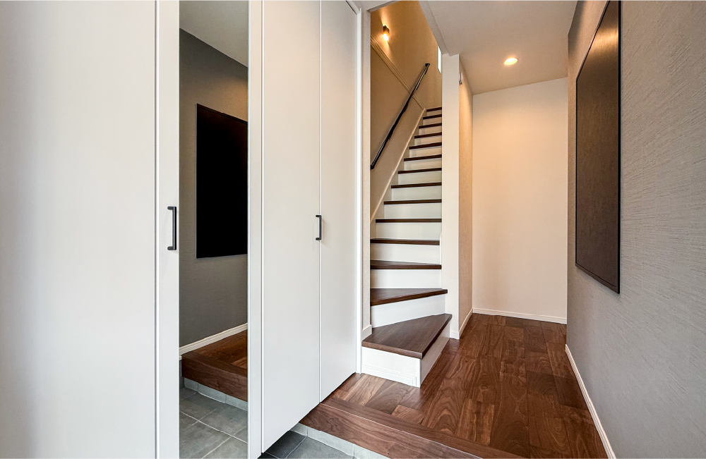 1階廊下の洗面脱衣室前に、家族で使える共用のウォークインクローゼットを設置しました。衣類やタオルをすっきりと収納できるほか、パジャマや下着をまとめて保管しておけば、お風呂の準備もスムーズに進みます。家族みんなの暮らしをより快適にする、便利で機能的な収納スペースです。