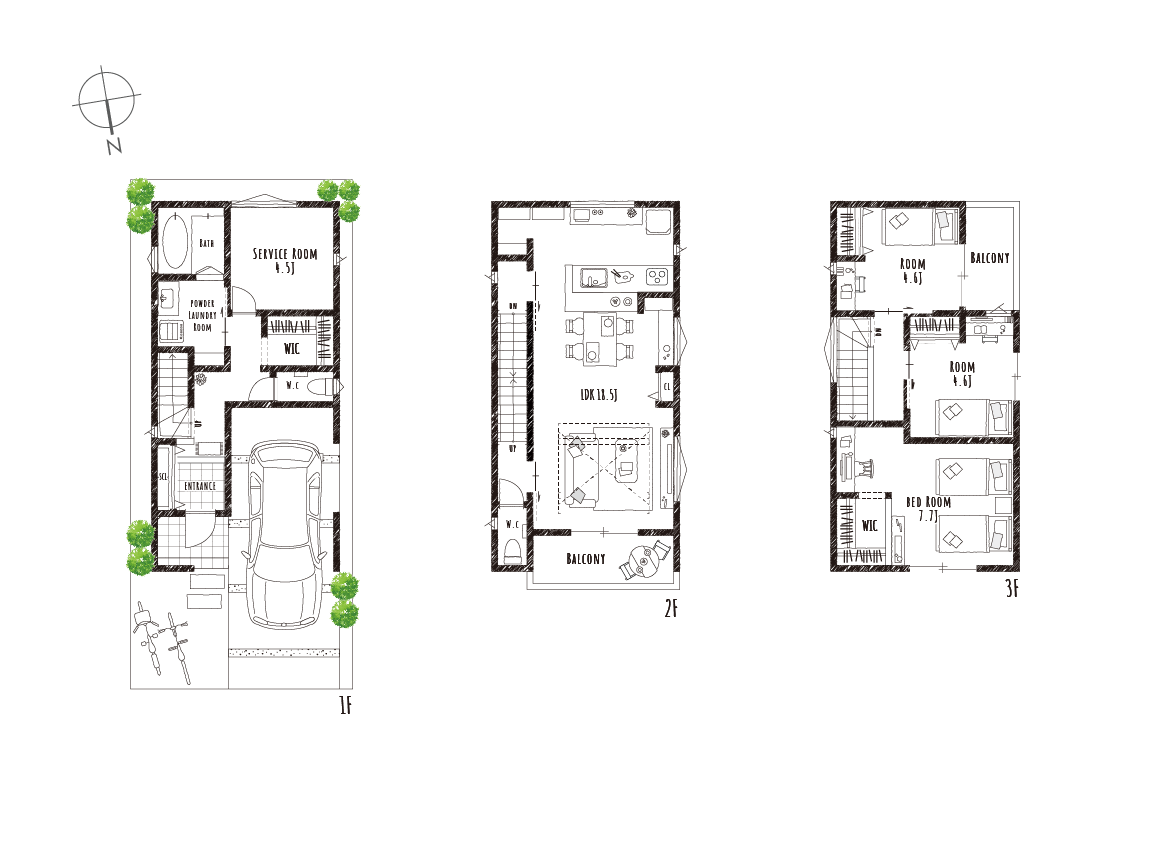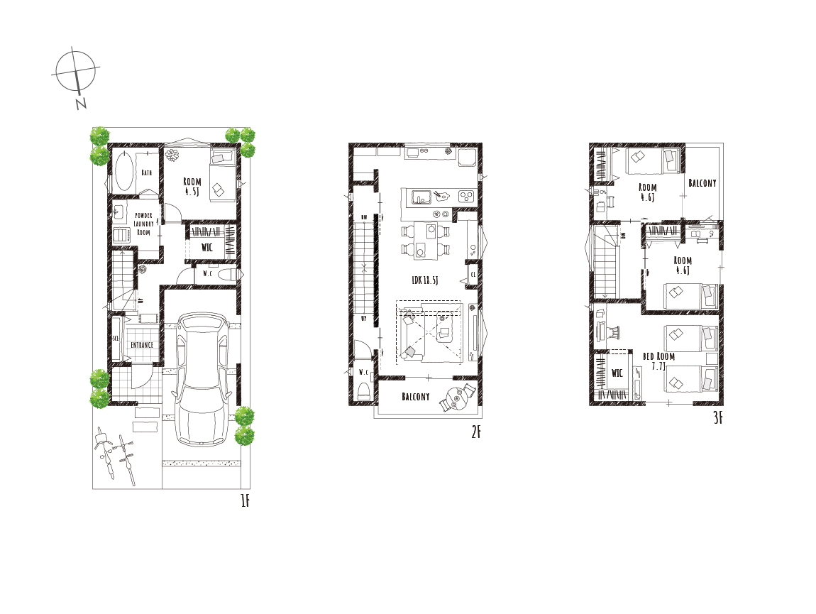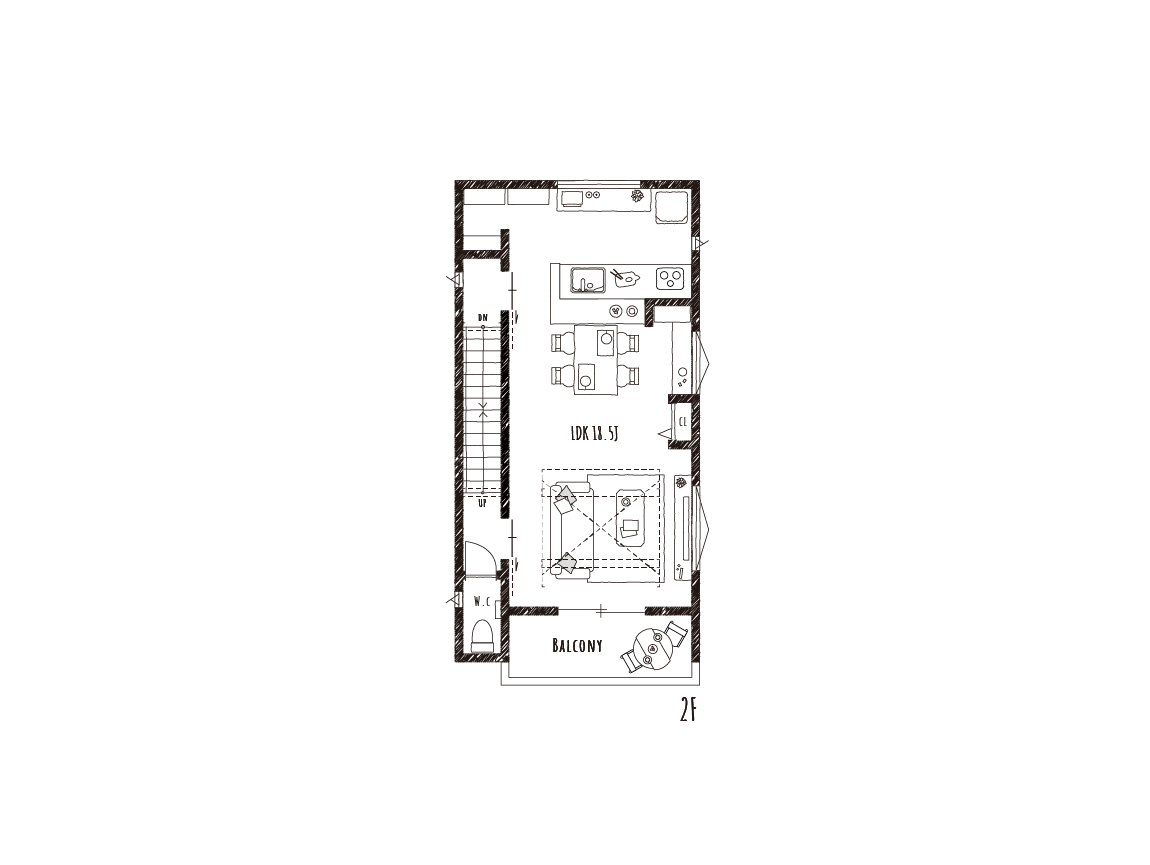 家族が集まるLDKに開放感と奥行きをもたらす、スタイリッシュなデザインの天井が印象的なお家です。キッチンは折り下げ天井を採用することで落ち着いた雰囲気に仕上げられ、料理がしやすい環境に。リビングは折り上げ天井になっており、視覚的にも広がりを感じられる開放的な設計です。キッチンからリビングへと続く空間は奥行きを感じさせ、全体的に広々とした印象を与えてくれます。また、2つのウォークインクローゼットをはじめ、パントリーやリビング収納など、あらゆる場所に機能的な収納スペースを確保。使ったものをすぐ片付けられるので、いつでもお家をスッキリと保つことができます。18.5帖の広々としたLDKには、さらに広がりを感じられる工夫を随所に凝らした、のびやかで快適な毎日を過ごせる住まいです。
