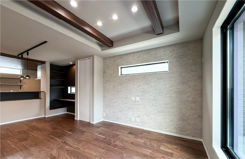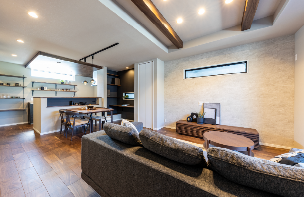 リラックスした時間をみんなで共有できるリビングは、折り上げ天井を採用することで開放感を演出しました。梁を見せることで空間のアクセントとなり、立体感のある魅力的な雰囲気を作り出します。広がりのある天井が、家族で過ごすひとときをより特別で心地よいものにしてくれます。