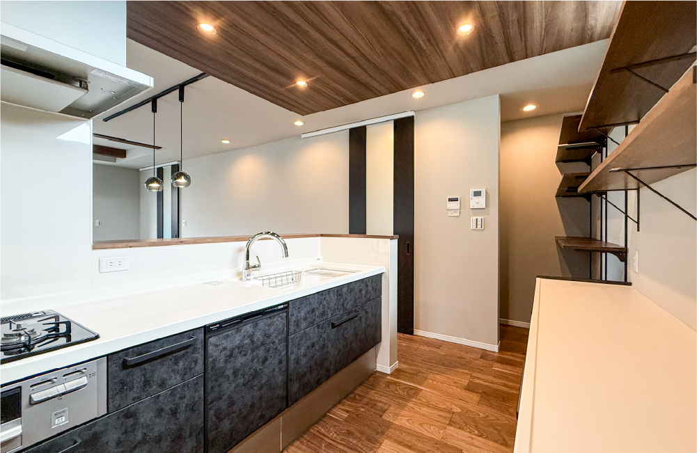キッチンの上には折り下げ天井を取り入れ、リビング・ダイニングと緩やかに空間を分けています。落ち着いた雰囲気の中で、リラックスしながらお料理を楽しむことができます。隣には可動棚付きのパントリーを設けているので、食材や日用品をスッキリと収納でき、とても便利です。