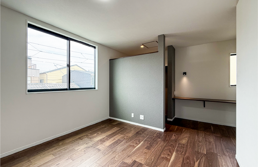 本や書類をスッキリ整理できる収納を備えた、集中しやすいおこもり感のあるワークスペースを設置しました。キッチンからは、勉強する子どもたちの様子を見守りながらお料理ができるほか、リビングで遊んだりお昼寝をしている子どもたちを見守りつつ在宅ワークを進めることもできます。